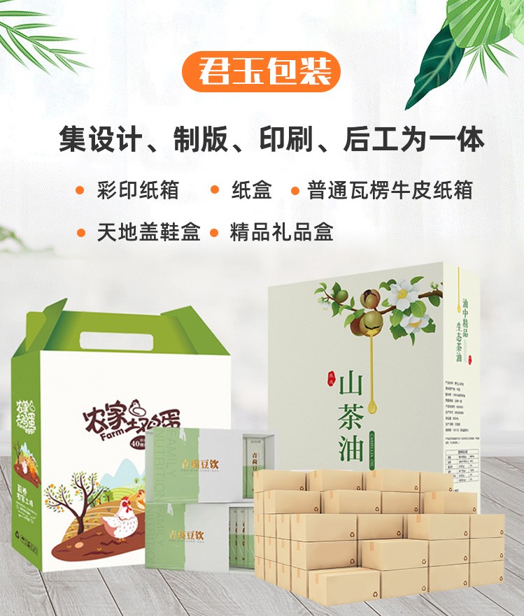 武陟縣君玉包裝有限公司是一家集設(shè)計、制版、印刷、后工為一體的紙制品生產(chǎn)企業(yè),產(chǎn)品主要分類:彩印紙箱、紙盒、普通瓦楞牛皮紙箱、天地蓋鞋盒、精品禮品盒等紙制品包裝。